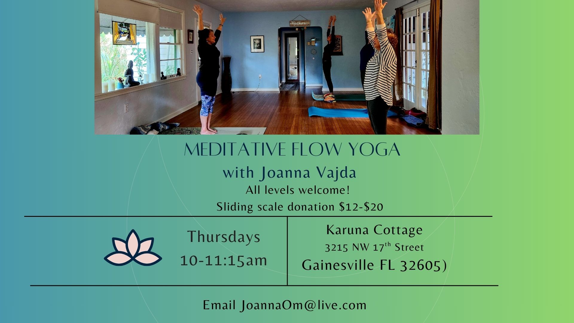 Class is donation-based with a suggested sliding scale donation of $12-20 per class.